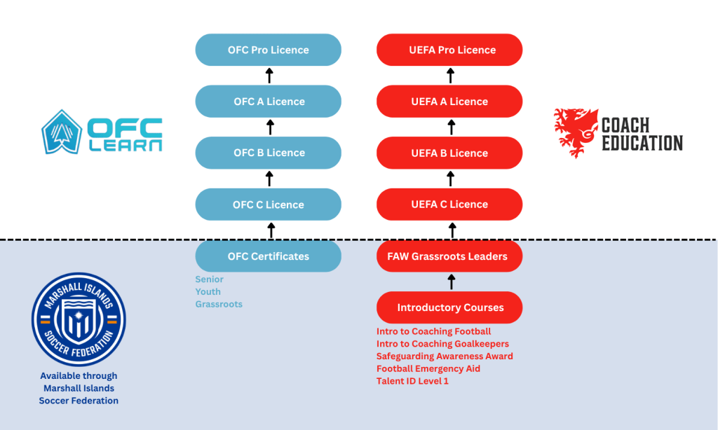 The Marshall Islands Soccer Federation (MISF) are able to deliver a number of coaching certifications through our partnerships. Below we show which qualifications we offer, and where they sit on the coaching pathway.
